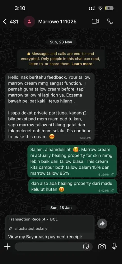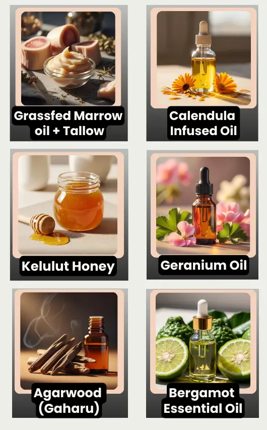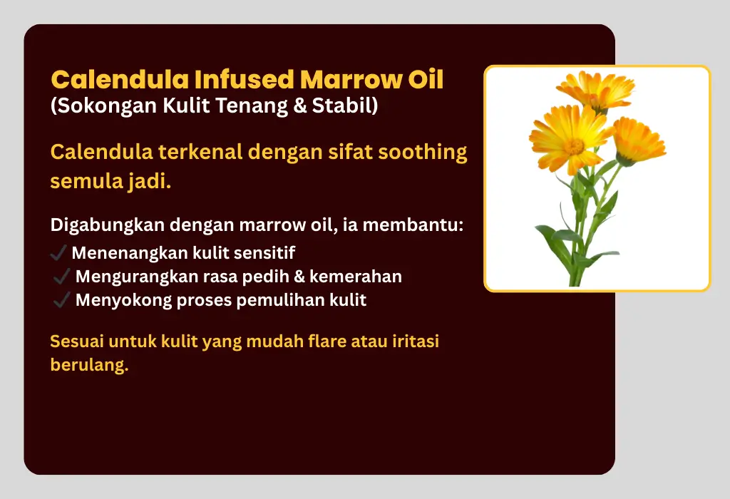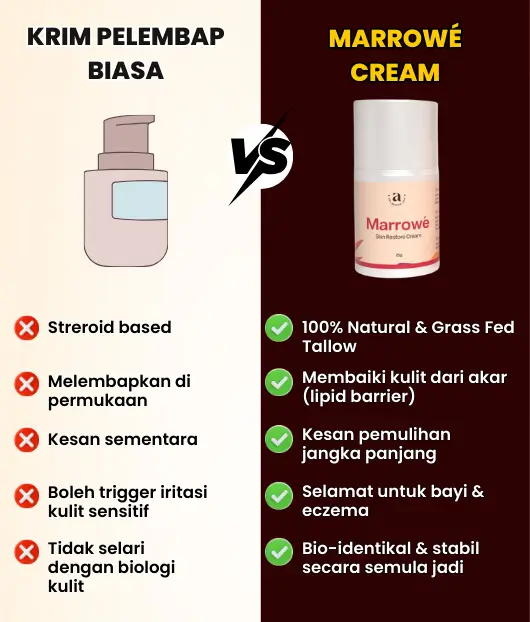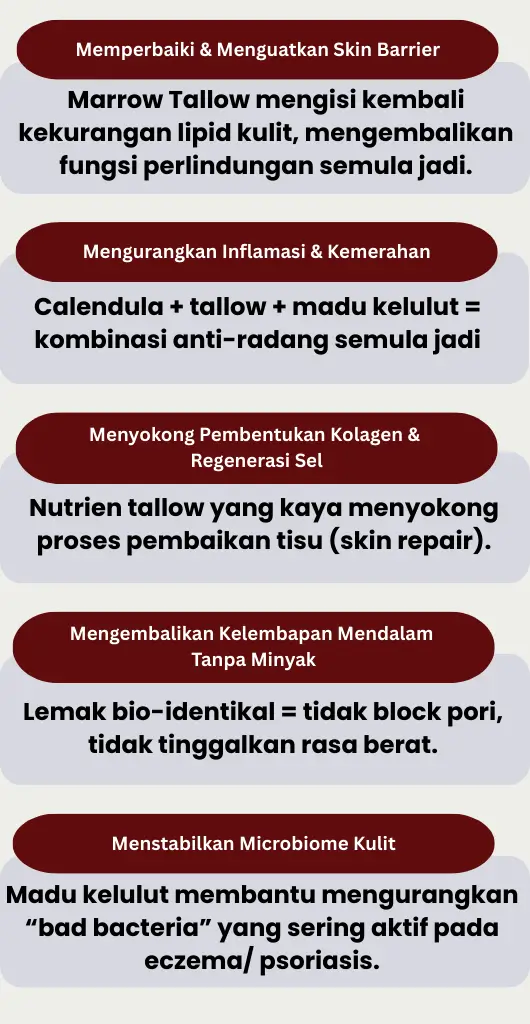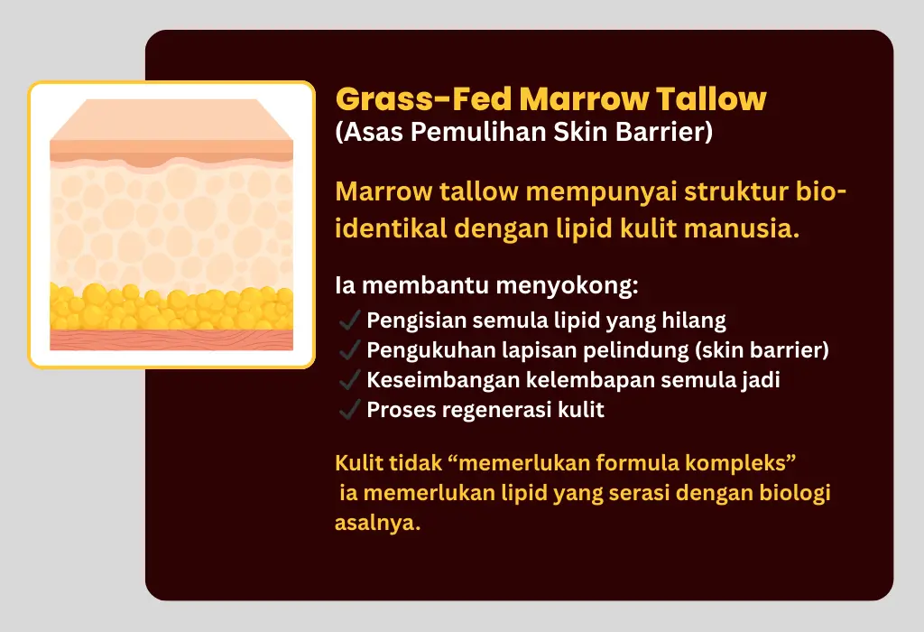 Marrow tallow meniru lipid kulit, menguatkan barrier, kurangkan inflamasi & percepat pembaikan sel.