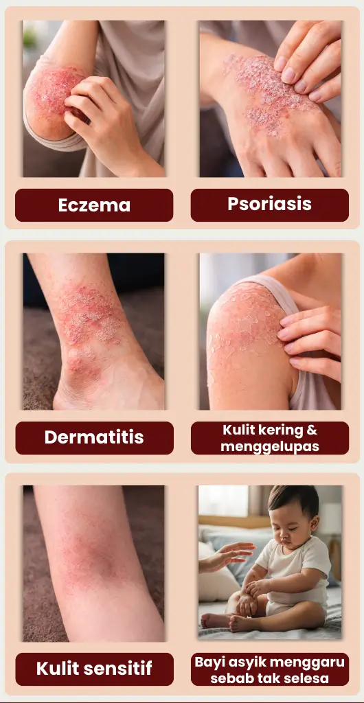 Eczema, psoriasis, kulit kering, dermatitis, kulit sensitif, ruam bayi, dan kulit menggelupas.